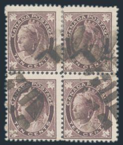 74ii, Block with the UR stamp having the MAJOR RE-ENTRY. The LL stamp has a lesser re-entry in 'CA' of 'CANADA'. An interesting lot. F, NH