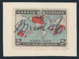 2¢ Map stamp on piece. The stamp has been autographed by WILLIAM MULOCK - the famous Canadian Postmaster General of Canada responsible for this stamp. A nice item for the Map collector. VF (Image)