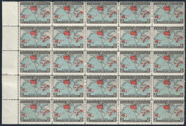 margin block of 25 stamps with deep blue oceans. Shows a guideline in left margin. F, 21 stamps are NH. A PRETTY MULTIPLE! (Image)