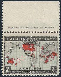 Beautiful top margin single with full PLATE IMPRINT (Plate 1, Pos 3). The stamp also has a RE-ENTRY visible throughout CANADA POSTAGE and 2's. VF, NH (Image)