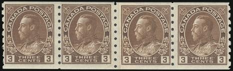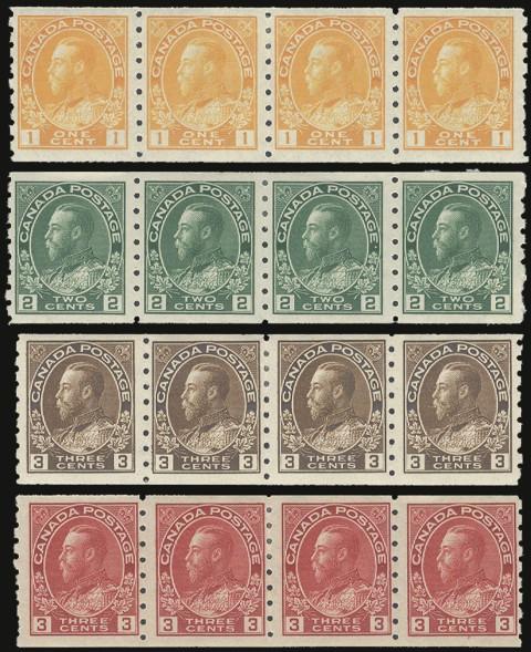 128-30, Coil strips of 4. Crease in one of 128, otherwise F-VF, 2 NH in each (Image)