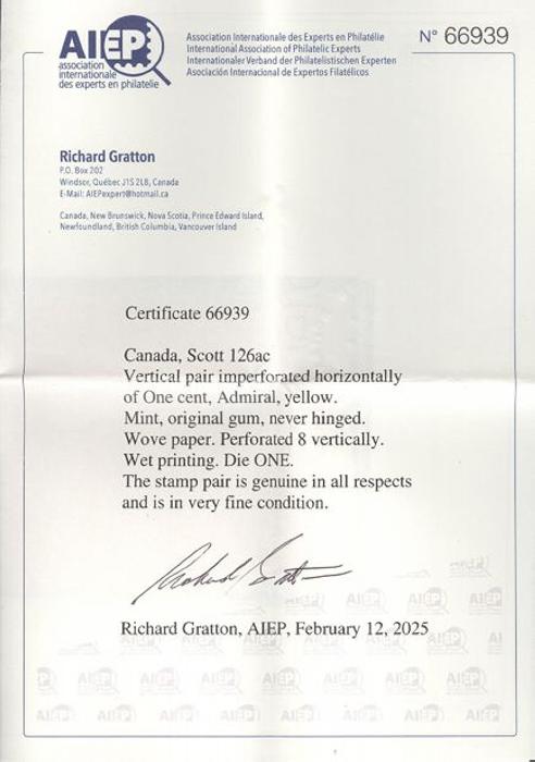 Vertical pair of Die I, Imperforate horizontally. Fresh, VF, NH. VERY SCARCE. Has 2025 Gratton Certificate (Image) (View Certificate)