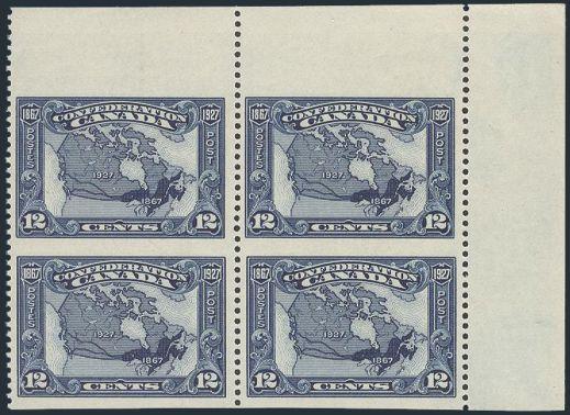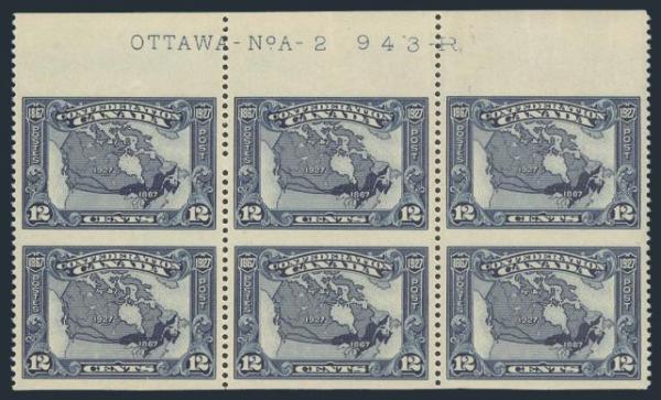 top margin IMPERF HORIZONTALLY PLATE BLOCK of 6 of the 1927 Map of Canada issue. VF, NH, some natural wrinkles. Very rare as only 5-10 part imperf Plate Blocks are known!