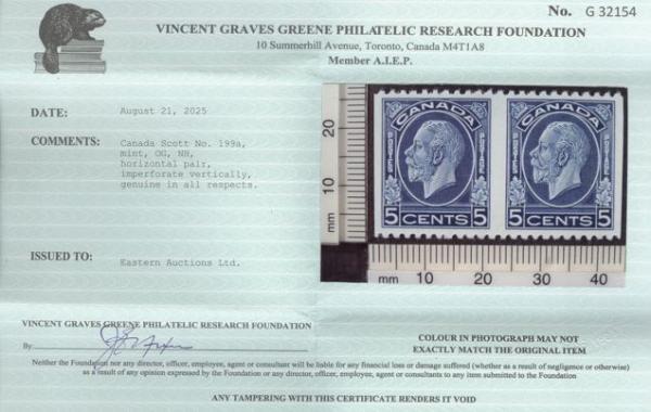 5688 199a image199a, Horiz pair IMPERFORATE VERTICALLY, perfectly centered, bright fresh colour, XF, NH. Has 2025 Greene Foundation Certificate. ONLY 50 PAIRS EXIST AND THIS IS AMONGST THE FINEST (Image) (View Certificate)