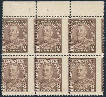 5723 218 image218, Top margin block of 6 with a MAJOR MISPERF error. F-VF, NH. An eye-catching item (Image) Estimate 275.00+ $Cdn