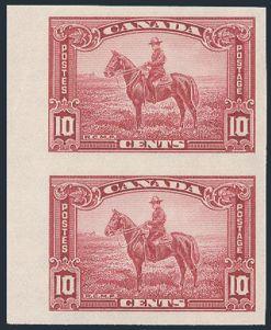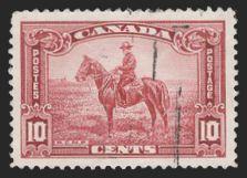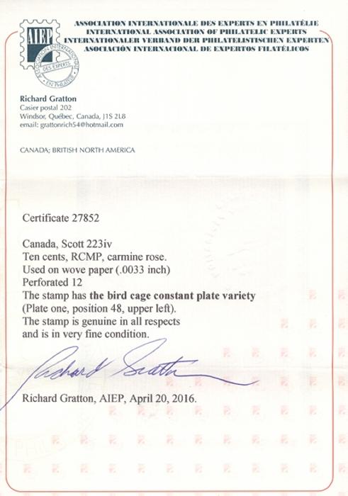 "BIRD CAGE" variety on the 10¢ Mountie. Nicely centred, lightly cancelled. VF. Has 2016 Gratton Certificate (Image) (View Certificate)