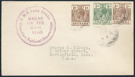 Eye-catching collection of 9 diff covers & postcards carried aboard Cdn Ntl Steamship Lines R.M.S. LADY DRAKE, from 1934-8. Have frankings from 8 diff islands plus Bermuda. Addr to USA & Canada. All have Lady Drake ship cancels in a variety of types & colours. She was sunk by U-Boat 106 on 5 May 1942. VG-VF (Image)
