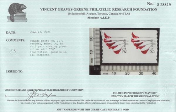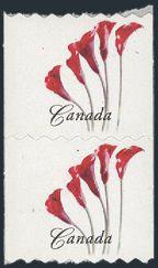 pair of the 50¢ Red Calla Lily with MISSING GREEN COLOUR resulting in no value. VF, NH. Has 2021 Greene Foundation Certificate (Image) (View Certificate)