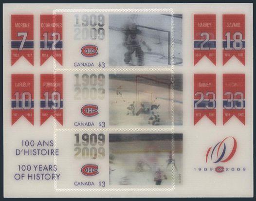 Montreal Canadiens $9 souvenir sheet with a MAJOR SHIFT OF THE DIE CUTTING. The die cutting is dramatically shifted to the left by at least 6mm. VF, NH. VERY RARE AND THE FIRST WE HAVE SEEN LIKE THIS! (Image)