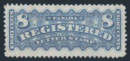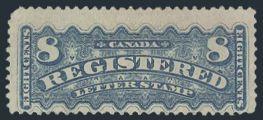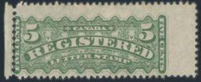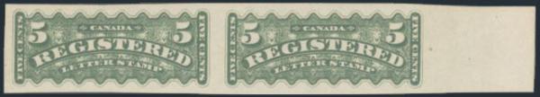 6053 F2c imageF2c, Right margin horiz IMPERF PAIR of the 5¢ Registered, VF, NG, small tear. Only 200 pairs known. Cat $1,500 (Image) Estimate 700.00+ $Cdn