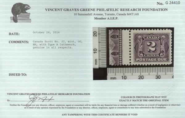 6059 J2 imageJ2, Left margin single with Full TYPE A LATHEWORK, pristine fresh colour, nicely centered. VF, NH. Has 2016 Greene Foundation Certificate. A KEY LATHEWORK STAMP (Image) (View Certificate)