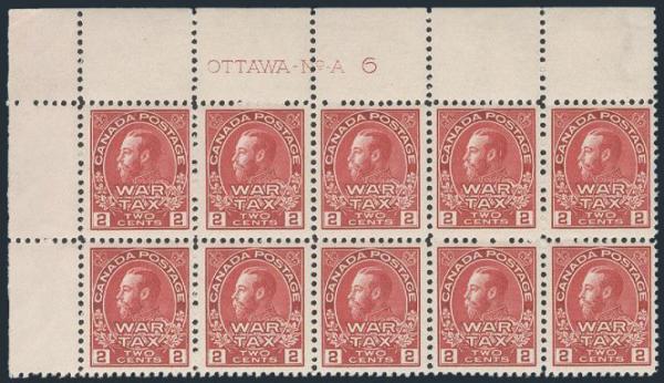 6075 MR2 imageMR2, UL corner PLATE A6 BLOCK of 10, Fresh, nicely centered, VF, NH (Image) Cat 1,800.00
