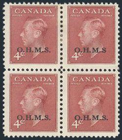6104 O15b imageO15b, Block with the UR stamp with NO PERIOD AFTER "S" variety. F-VF, unfortunately the variety stamp has a thin (Image) Cat 500.00