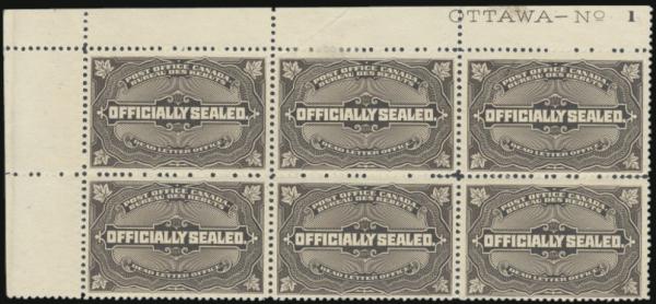 6120 OX4 imageOX4, UL corner margin block of 6 with "OTTAWA No 1" PLATE IMPRINT. Fresh, VF, 4 stamps are NH, couple creases. A VERY RARE IMPRINT POSITION BLOCK. Cat $8,400 (Image) Estimate 1,750.00+ $Cdn
