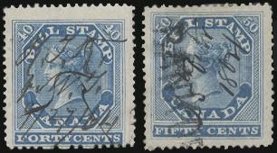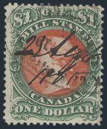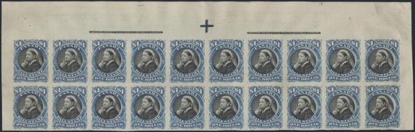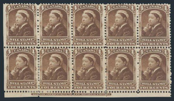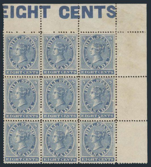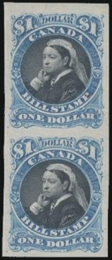 6196 FB52a imageFB52a, Imperforate top margin block of 20 of the QV $1 Third Bill issue. Has two Plate Imprints and cross guideline at the centre. Large margins all around, rich colours. VF, NH, ungummed as issued, light centre fold. A REMARKABLE SHOWPIECE & ONLY A FEW EXIST LIKE THIS (Image) Estimate 1,500.00+ $Cdn