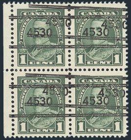 6176   imageToronto 13-217D, Margin block with an eye-catching DOUBLE PRECANCEL. VF, bottom stamps are NH (Image) Estimate 50.00+ $Cdn