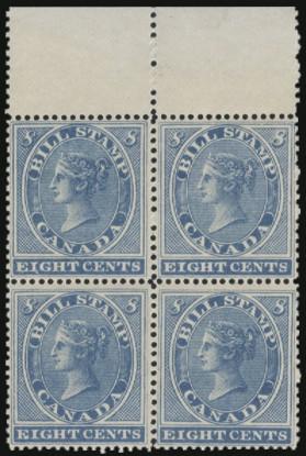 6187 FB8 imageFB8, QV 8¢ Bill Stamp fresh top margin block. VF, NH. RARELY SEEN IN THIS TOP CONDITION (Image) Cat 180.00