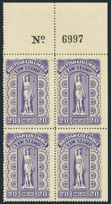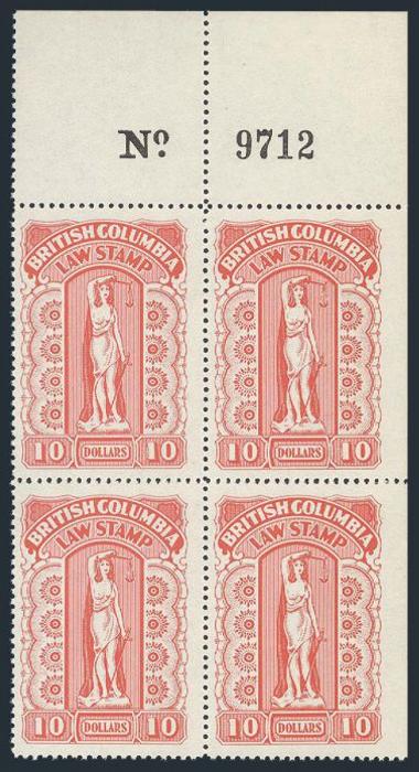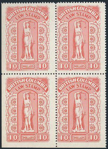 6184 BCL57, BCL57a imageBCL57, BCL57a, LL sheet margin block of the $10 Br. Columbia Law Stamp. The UL stamp has the flaw above "C" of COLUMBIA variety. VF, NH. A nice positional block (Image) Cat 312.50