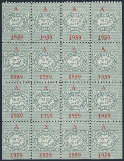 6278 TBT152 imageTBT152, Bell Telephone 1959, block of 16, 13 stamps are WATERMARKED. VF, NH (Image) Cat 562.00