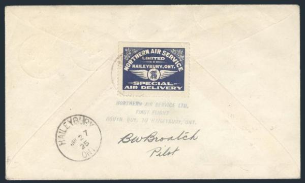 Northern Air Service tied on Rouyn to Haileybury 27 June 1925 FFC. Pilot signed by PILOT W. BROATCH. F, rib toning in cover (Image)