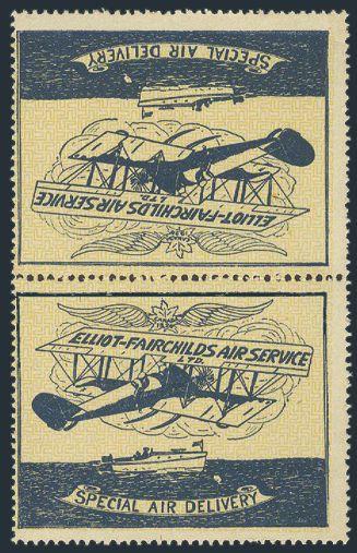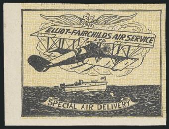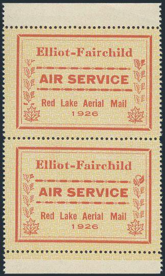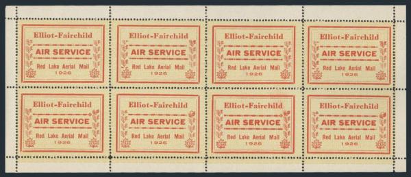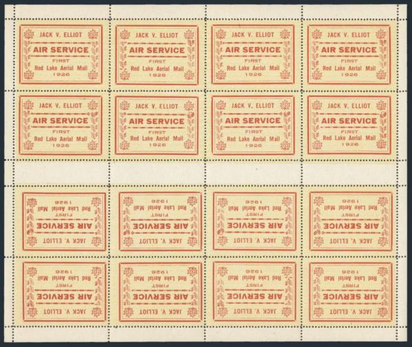 intact sheet of 16 of the Jack V. Elliot Air Service, displaying four tete beche gutter margin pairs. Nicely centered, fresh rich colour, VF, NH. VERY FEW INTACT SHEETS LIKE THIS EXIST (Image)