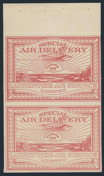 Laurentide Air Service Booklet Pane of 2, the top stamp darker than bottom. The gum on the top has red printer's offset. VF, NH, some light DG from Booklet interleaving