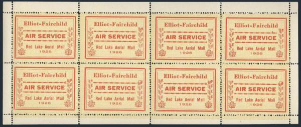 Complete sheet of 8 of the Elliot-Fairchild Air Service. Positions 2 and 4 have the TALL 'R' variety and other stamps show minor varieties. VF, NH (Image)