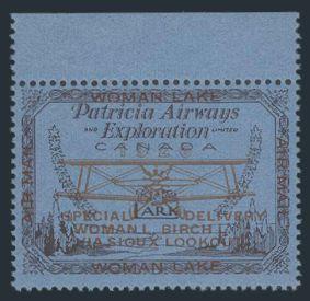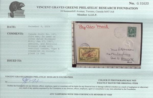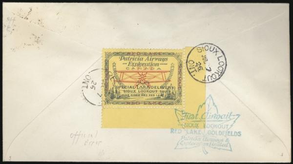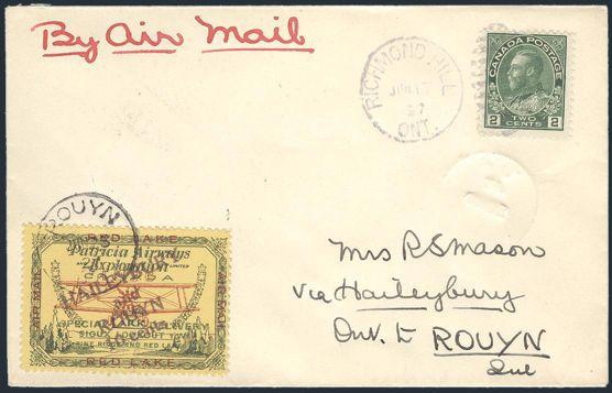 (variety), Patricia Airways tied by Rouyn 25 June, 1927 CDS on airmail cover with Haileybury and Rouyn b/s's. The stamp has the TYPE A OVERPRINT IN VIOLET, WITH THE PLANE IN RED. Unitrade lists the violet overprint only with the violet plane. The red