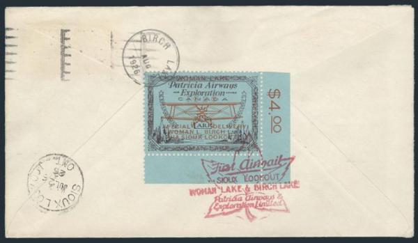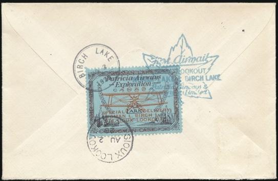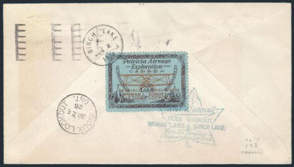 Patricia Airways tied on cach Birch Lake to Sioux Lookout FFC, 2 Aug 1926. Has blue-green cach, front & back (only 105 pieces flown). F-VF (Image)