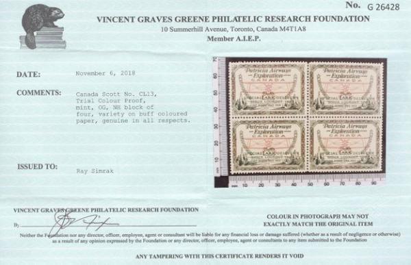 plane is probably equally rare and no unused stamps are known. VF, stamp with a small crease. Has 2024 Greene Foundation Certificate. Possibly a unique cover and needs a new listing in Unitrade. (Cat $5,000 for CL14giii) (Image) (View Certificate)