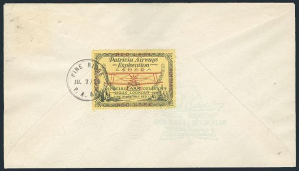 CL13, Patricia Airways tied on cach Pine Ridge to Sioux Lookout 7 July 1926 FFC. Also franked by Map stamp MUDDY WATER variety. F, cover has rib toning (Only 140 pieces flown)