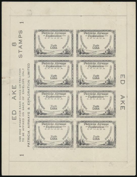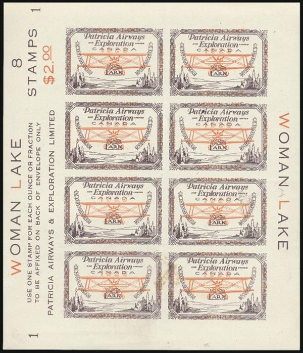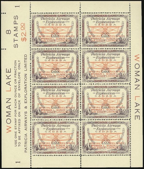 Patricia Airways IMPERFORATE TRIAL COLOUR PANE OF 8 with "Woman Lake" inscriptions (on the stamps) in ORANGE, printed on white paper and with SCARCE brownish black frames. UNLISTED VARIETY FROM THE ALGATE ESTATE. VF, vert crease (Image)