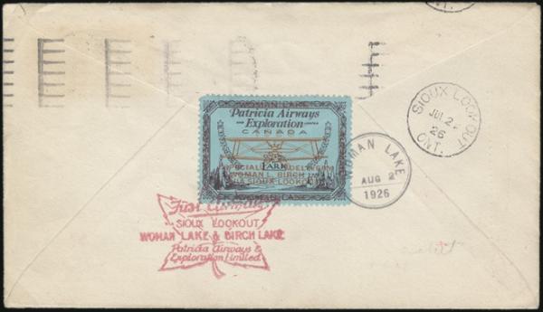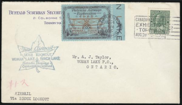 Patricia Airways tied on front of cach Woman Lake to Sioux Lookout FFC, 2 Aug 1926 (stamp tied on front of cover contrary to regulations). VF (Image)