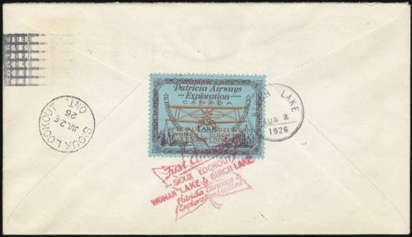 Patricia Airways with SMALL "V" in "VIA" variety neatly tied on FFC Sioux Lookout to Birch Lake 26 July 1926. F (Image)