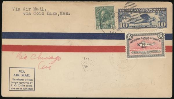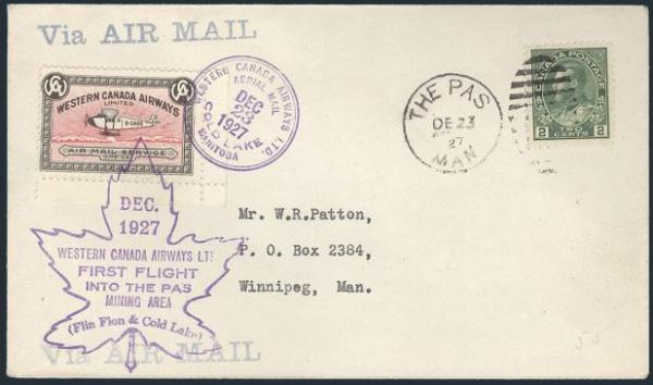 Western Canada Airways tied by cachet on The Pas to Cold Lake 23 Dec 1927 FFC, addr to Roessler. Canada #128 & USA #C10 also tied (Only 231 pieces flown). F, bit toned