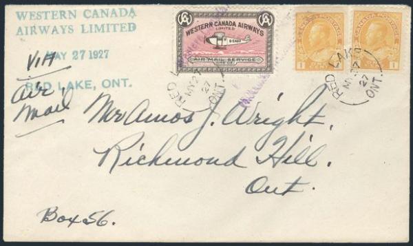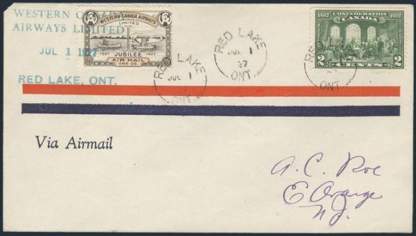 Western Canada Airways Jubilee issue tied by Red Lake 1 July 1927 split-ring cancel on Airmail cover addr to Roessler. Stamp also tied by green Western Canada Airways 4-line cachet. VF, one minor corner rounded (Image)