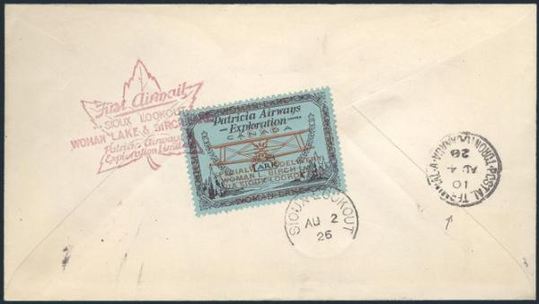 Patricia Airways with "OTT" variety in "LOOKOUT", neatly tied on cach FFC Woman Lake to Sioux Lookout 2 Aug, 1926. VF, Cat $750 (Image)