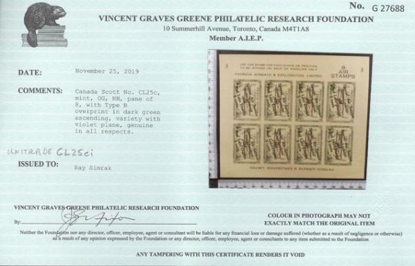 Complete pane of 8 with Type B overprint in dark green ascending and VIOLET PLANE. Has Plate no. 3 imprint. Fresh, VF, NH. Has 2019 Greene Foundation Certificate. Scarce