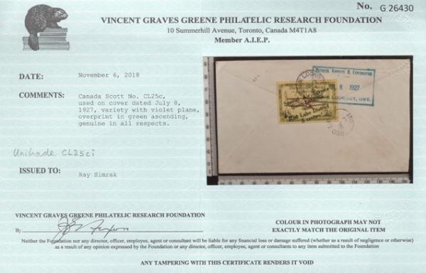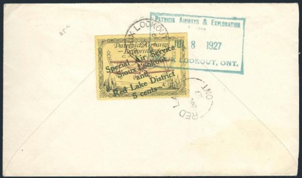 Tied on Red Lake to Sioux Lookout 8 July, 1927 flight cover, VF. Has 2018 Greene Foundation Certificate (Image) (View Certificate)