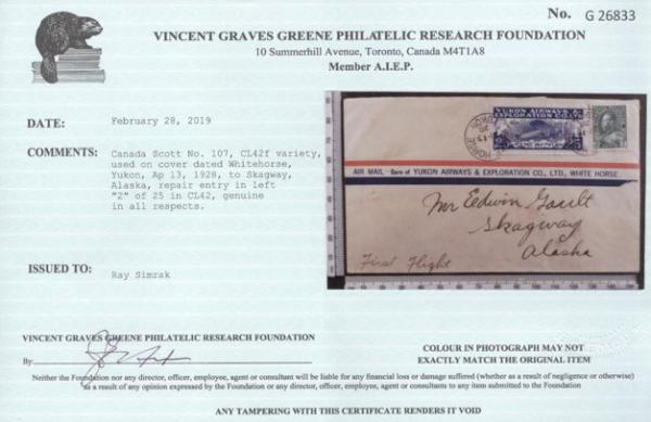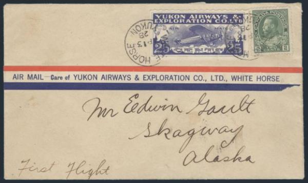Yukon Airways with REPAIR ENTRY IN LEFT "2" OF "25", tied on FFC Whitehorse to Carcross 13 Ap, 1928. Addr to Skagway, Alaska. VF. A VERY SCARCE VARIETY ON COVER. Has 2019 Greene Foundation Certificate (Image) (View Certificate)