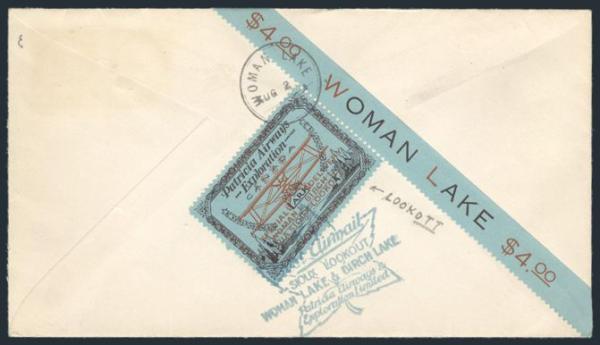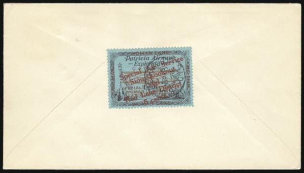 Patricia Airways sheet margin single with full "$4.00 WOMAN LAKE $4.00" imprint in the selvedge. The stamp has the "OTT" variety in "LOOKOUT". Neatly tied on Sioux Lookout to Woman Lake FFC 2 Aug, 1926. VF (Image)