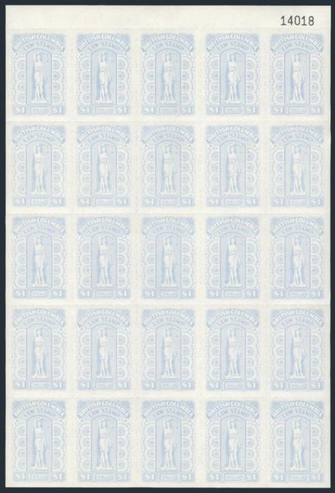 BCL63, Complete sheet of 25 of the $1 Br. Columbia Law Stamp. Fresh, VF, NH, couple stamps with natural gum bends. VERY FEW FULL SHEETS EXIST LIKE THIS. Ex Bileski. Cat $7,812 (Image)