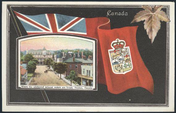 Very attractive collection of 18 diff Patriotic postcards mainly 1905-12 with colourful flags, maple leafs, crests, etc. Many nice multi-coloured types with central scenes from across Canada. Lots of better items. Also 2 diff patriotic greeting cards circa WWI. F-VF (20) (Image)