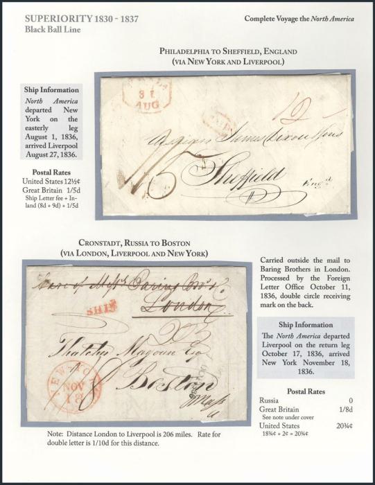Two stampless covers neatly written up on an exhibition page carried aboard Black Ball Line ship "The North America". Incl one from Philadelphia to Sheffield via New York and Liverpool; the other from Gronstadt, Russia to Boston via London, Liverpool and New York. This is the COMPLETE VOYAGE. Carried outside the mail to "Baring Brothers, London" m/s, Forwarding Agents. Nice variety of cancels and postal markings. F-VF. Ex Pullin (Image)