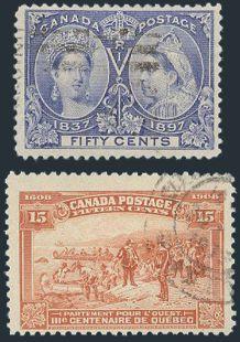 50/324, Decent collection on pages with a solid range of issues between these numbers. Has Jubilees to 50¢; QV Leaf set to 10¢; QV Numeral set to 20¢; KE set to 50¢; Quebec set to 20¢; various Admirals with useful coils; 3 diff imperfs & both surcharges; scroll set to $1 Parliament; Arch set to $1 Cavell; later sets to $1; Fish $1, etc. Mainly F-VF (335) (Image)