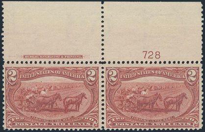 2¢ TRANS-MISSISSIPPI: 286, Specialized collection of 10 horiz margin pairs all with imprints and diff Plate Numbers. Fresh colours, F or better, NH