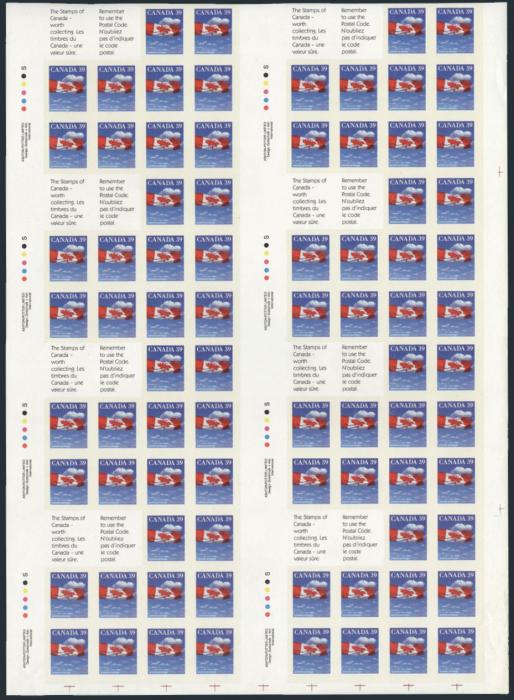 CANADA IMPERFORATE BOOKLET SHEET: 1166a, Rare IMPERFORATE Booklet Pane sheet containing 8 panes (with 10 stamps in each). Very scarce sheet and the first we have had like this. Fresh, VF, NH, a few minor selvedge