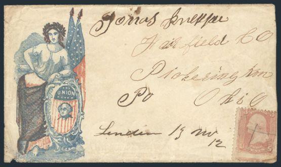 CIVIL WAR PATRIOTIC COVERS: 65, Collection of 4 diff used Civil War covers from the 1860's. All with coloured PATRIOTIC cachets incl Geo. Washington on horseback with flag; female allegorical figures with flags & one with Union shield;