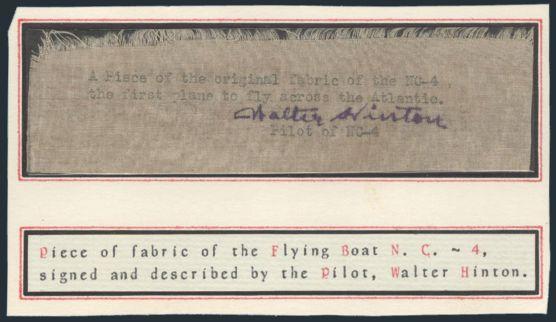 FABRIC FROM THE FIRST TRANS-ATLANTIC AIRCRAFT: Piece of the original fabric of the Curtiss NC Flying Boat "NC-4". It was the FIRST AIRCRAFT TO MAKE A TRANS-ATLANTIC FLIGHT IN MAY 1919. It is autographed by the famous