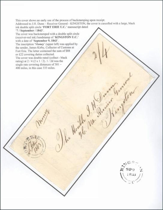 Stampless entire from Fort Erie UC, 7 Sept 1843 addr to Kingston US. Has m/s MONEY and rated "2/4". The letter is from James Kirby, Collector of Customs at Fort Erie. Nicely written up on an exhibition page. F (Image)